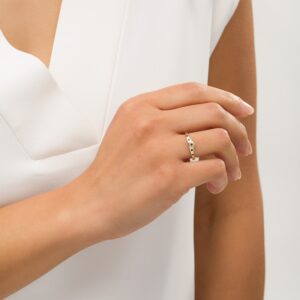 A gorgeous symbol of your love, this sparkling bridal; features an engagement ring with a romantic heart-shaped diamond haloed by glimmering round diamonds. The band and matching wedding ring are adorned with twists of round diamonds, bringing the total weight of the set to 7/8 carat. The ring is styled in 14K white gold.